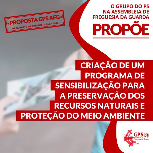 O Grupo do Partido Socialista na Assembleia de Freguesia da Guarda (GPS AFG) apresentou, a 02 de dezembro de 2022, em reunião com a Junta de Freguesia da Guarda tendo em vista a apresentação de contributos para a proposta de Orçamento e Plano de Atividades da Freguesia da Guarda para 2022, uma proposta para a criação de programa de sensibilização para a preservação de recursos naturais e proteção do meio ambiente.