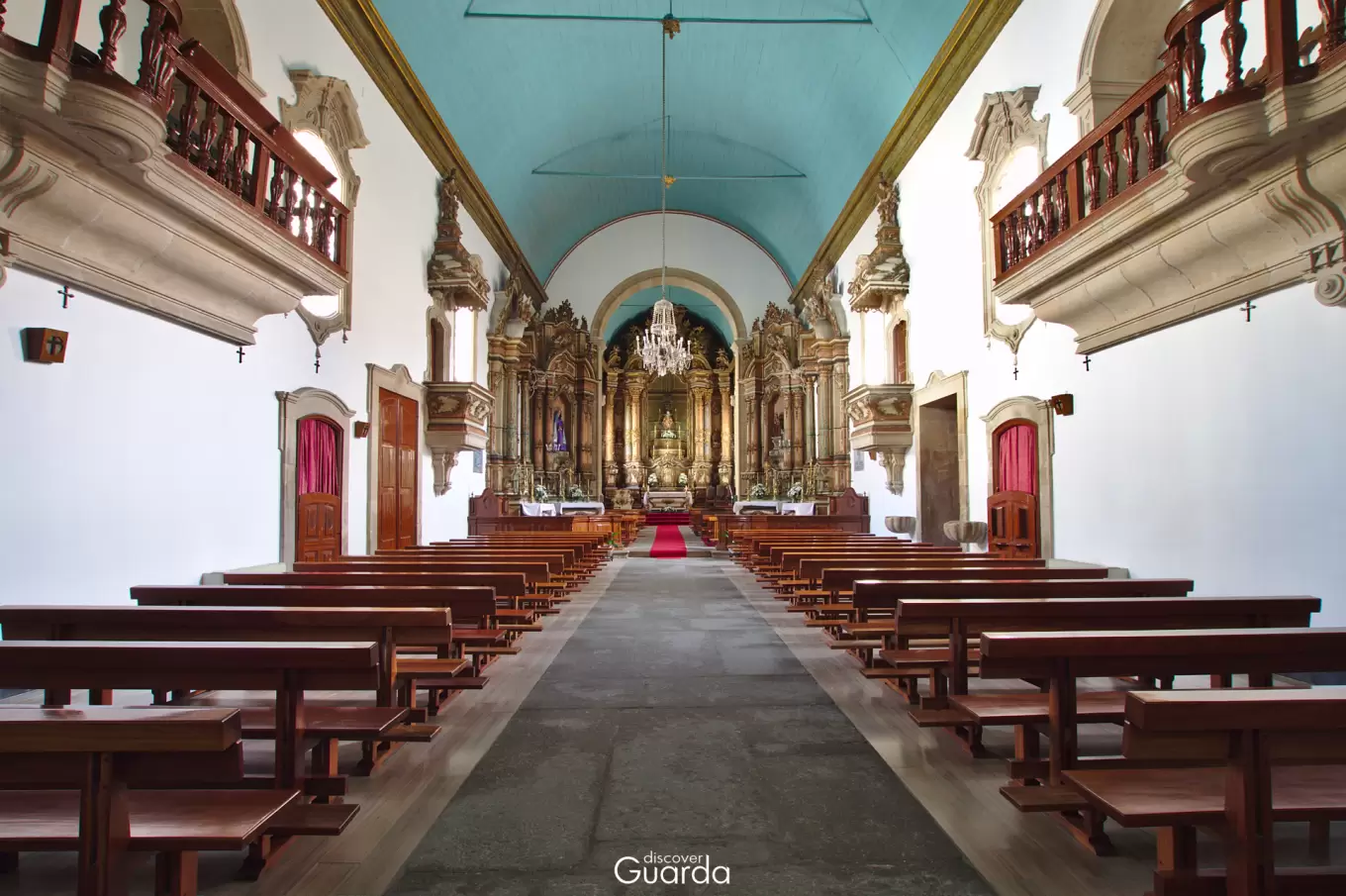 No interior, sobressai o coro alto, assente sobre arco em asa de cesto, os púlpitos, as tribunas laterais, os vãos com molduras em cantaria trabalhada, e a cobertura de madeira em berço. Todavia, são os retábulos de talha dourada, e policromada dos altares laterais, colaterais e mor que mais se destacam neste espaço. Os quatro retábulos da nave, apresentam um altar em forma de urna, com decoração bastante erudita. Já no altar-mor, as estruturas retabulares, também em forma de urna, são mais simples. Estas integram no lado Norte, o túmulo do fundador da igreja, e no lado Sul o esquife de Cristo.