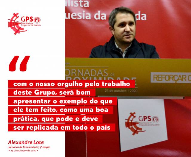 Alexandre Lote, Presidente da Federação Distrital da Guarda do Partido Socialista, usou da palavra na Sessão de Encerramento da 3ª edição das Jornadas de Proximidade do Grupo do PS na Assembleia de Freguesia da Guarda (GPS AFG), a 24 de outubro de 2020, para manifestar o seu orgulho pelo trabalho desenvolvido pelo GPS AFG, ao longo do presente mandato autárquico, garantindo que “é de facto assim que se ganha a confiança das pessoas e é com essa confiança que se ganham eleições, para melhorar o dia-a-dia das pessoas”.
